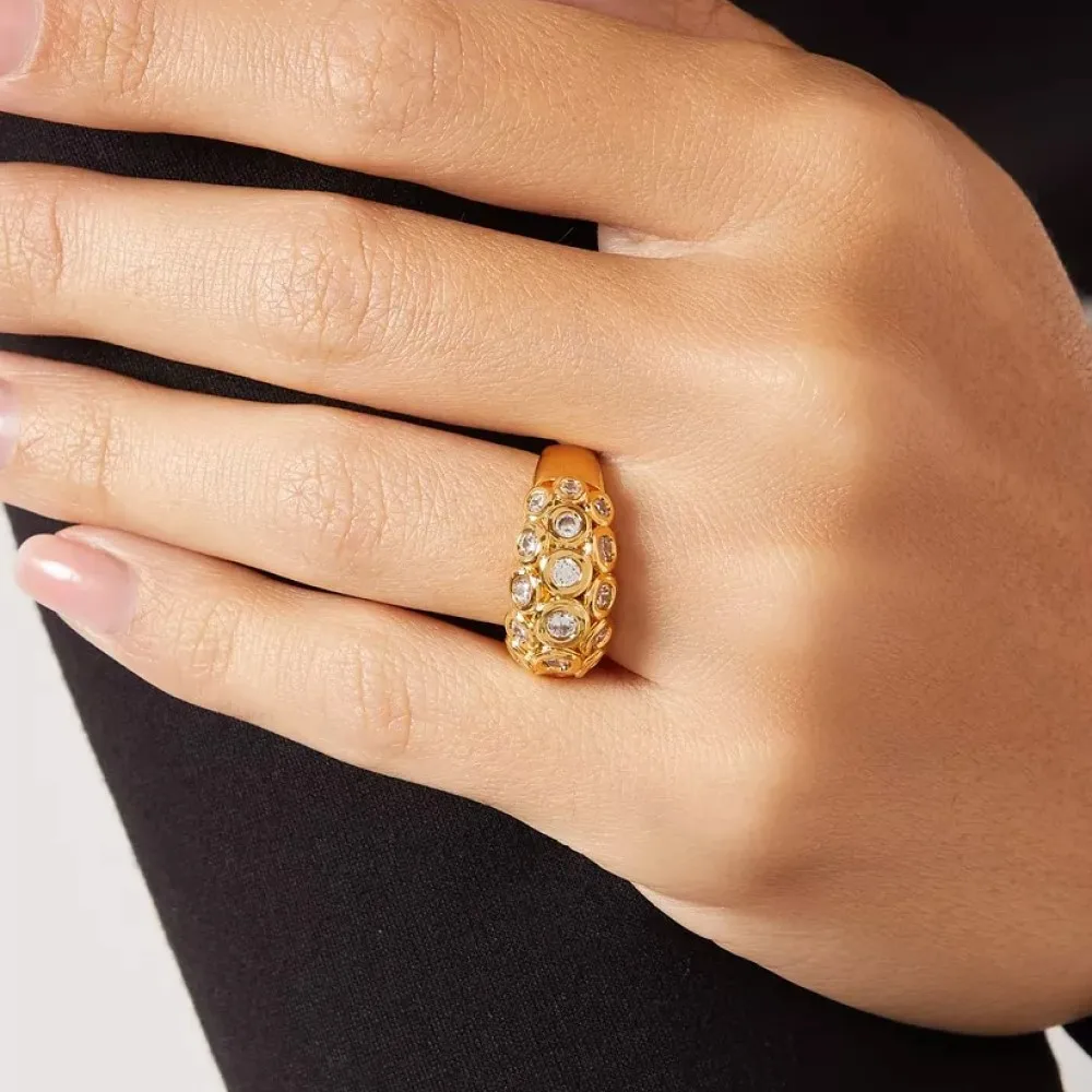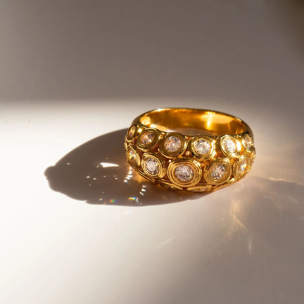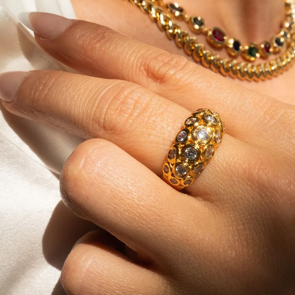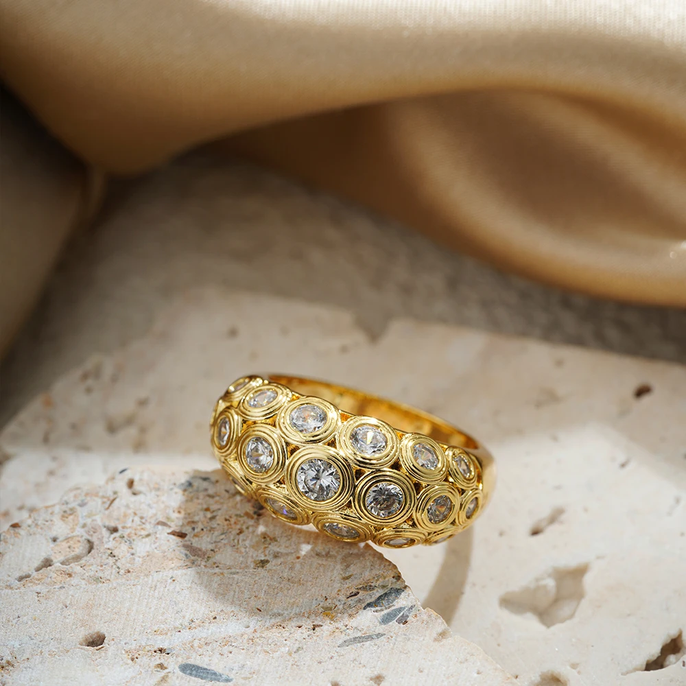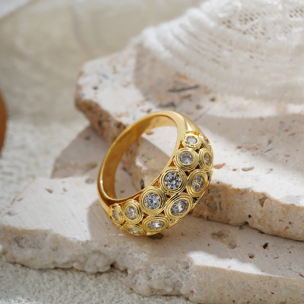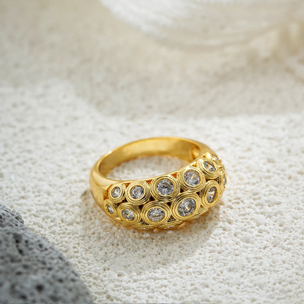 Add bold elegance to your look with this trendy 18K gold-plated ring. Made from durable stainless steel and inlaid with sparkling zircon, this round wedding band-style ring blends charm and edge—perfect for parties, anniversaries, or date nights. A stylish gift for brides, friends, or anyone who loves fashion with a bit of attitude.