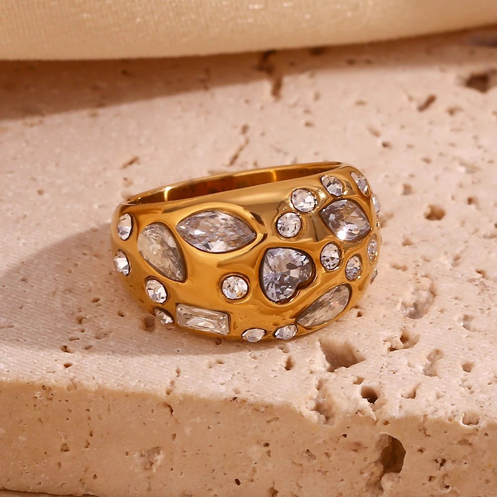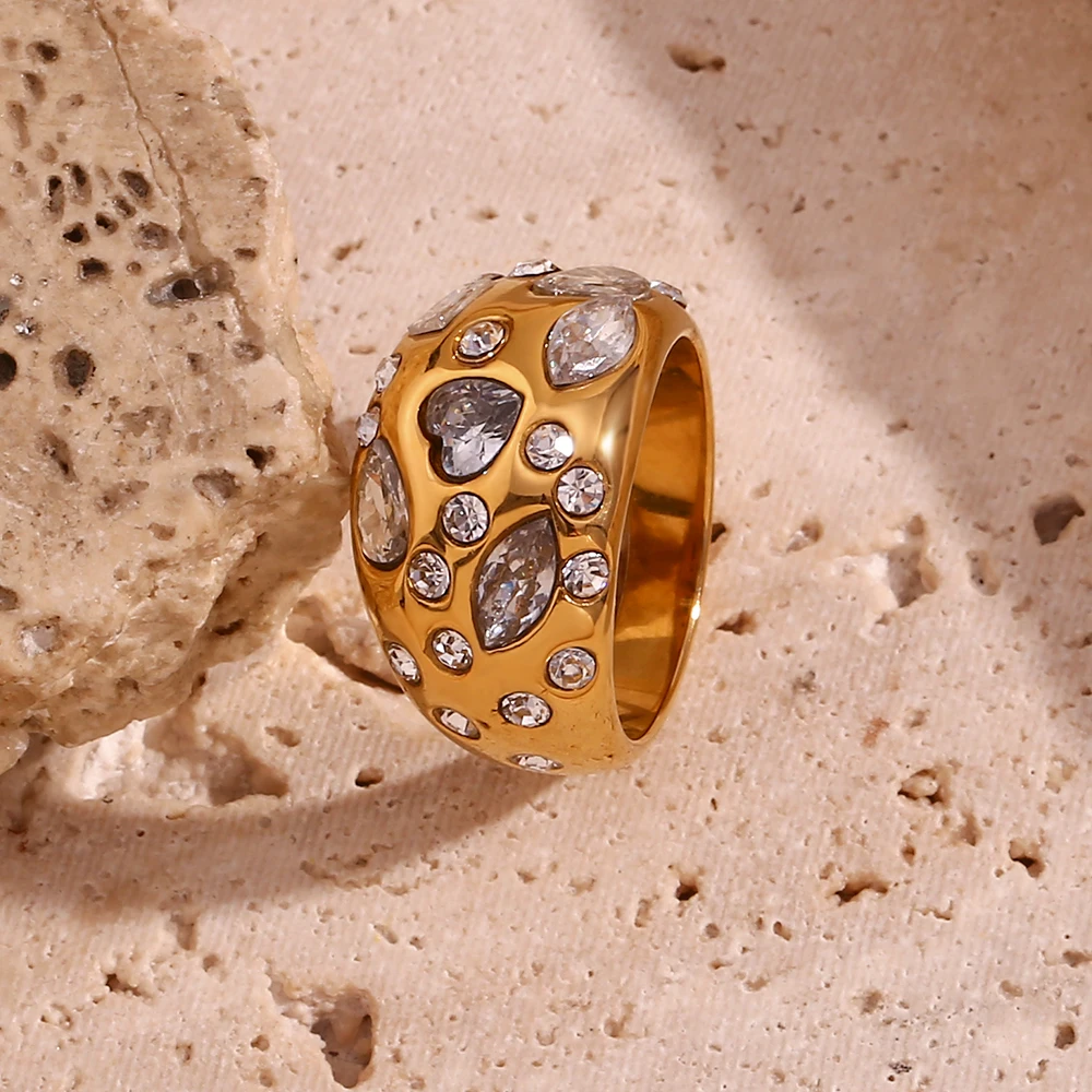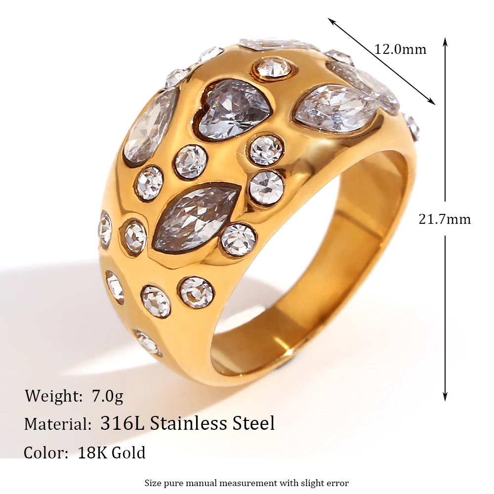 Crafted from high-quality 316L stainless steel and titanium, this hypoallergenic ring features a smooth, rounded dome design adorned with sparkling heart and horse eye-shaped zircon rhinestones. Its wide 12mm band makes a statement, while the invisible setting keeps the stones sleek and secure.